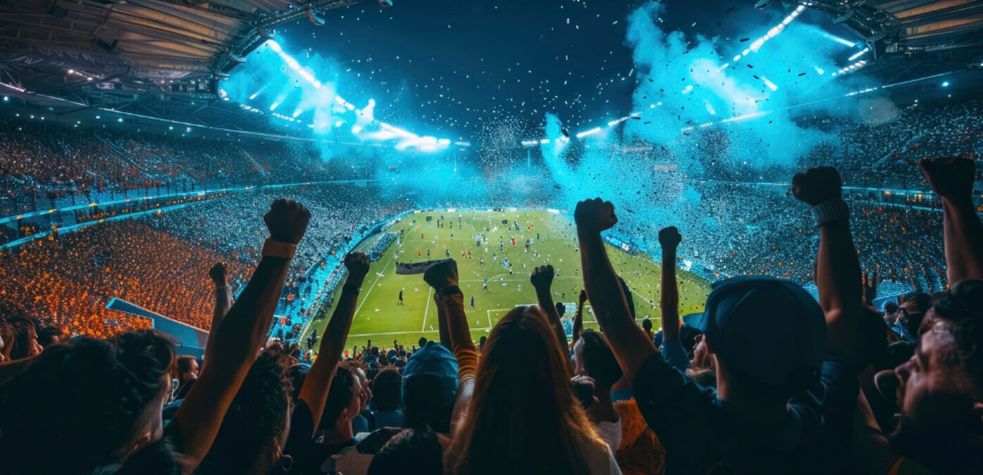 Wide shot striker kicking ball inside crowded stadium